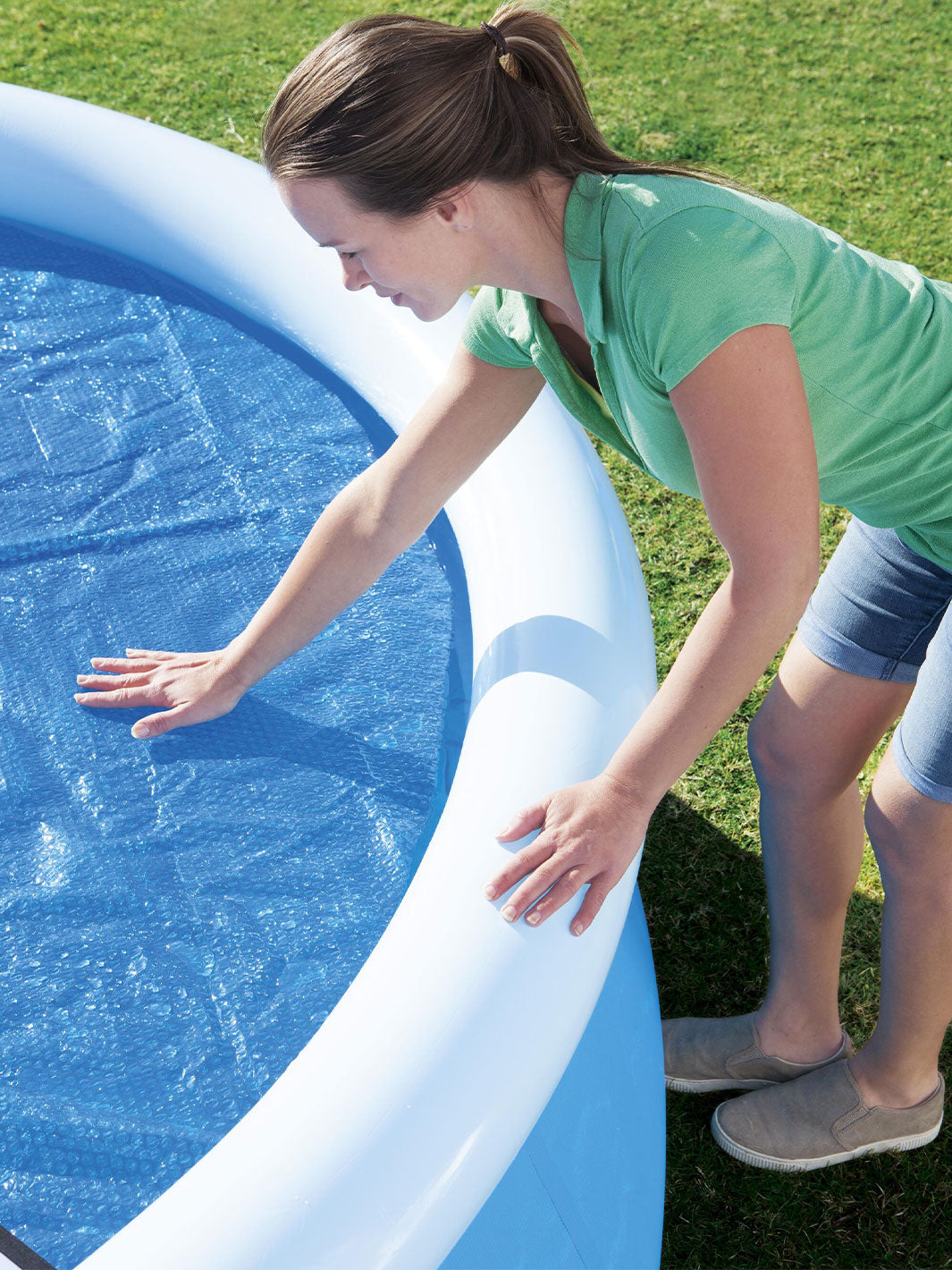 El Cobertor Solar Redondo Bestway de 2.89 m es el accesorio ideal para proteger y mantener tu alberca en perfectas condiciones durante todo el verano. Diseñado para albercas elevadas redondas de 3.05 m, este cobertor flota directamente sobre el agua creando un efecto invernadero natural que ayuda a conservar el calor y mantener una temperatura más agradable sin necesidad de gastar en energía extra.