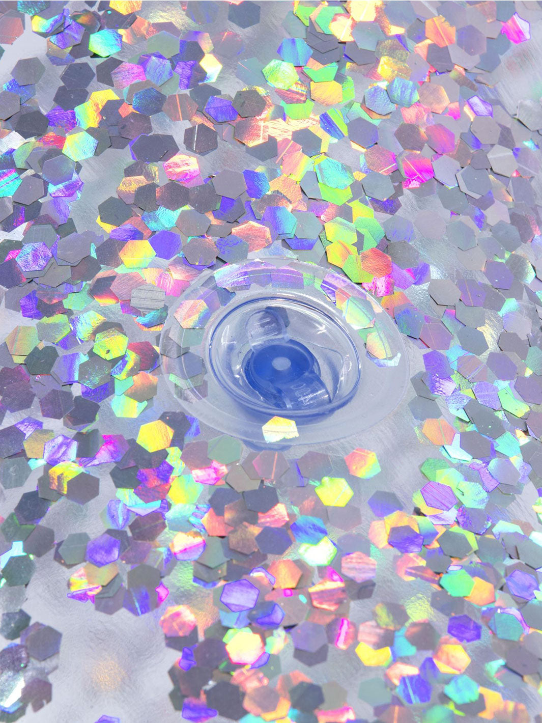 Diseño transparente con brillos plateados iridiscentes